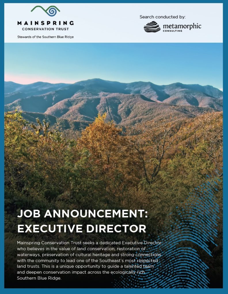 Mainspring is currently seeking a strategic, relational leader who is ready to carry forward the mission of a trusted land trust while honoring the unique cultural and ecological landscape of Southern Appalachia.